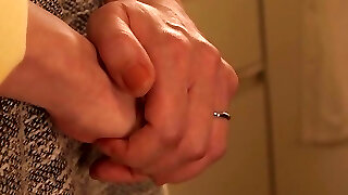 4'8'' 142cm 9 Month Knocked Up Asian Milf getting caressed all over with baby grease - Double cam view from below and in front