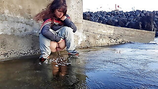 Elderly hairy pussy pissing in nature. Wet dirty cunt outdoors. Close-up and POV. Pawg and white panties. Chubby milf. Publi