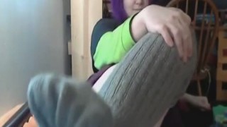 Ankle handcuffs footjob and a huge load of cum on ebony toes and feet
