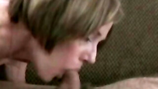 Busty grannie with glasses gives head and gets cum