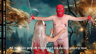 gorąca kochanka z dużymi cyckami dominuje nad swoim niewolnikiem w pończochach