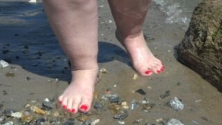Immense bare legs with red pedicure walk along the bank of the river, fetish.